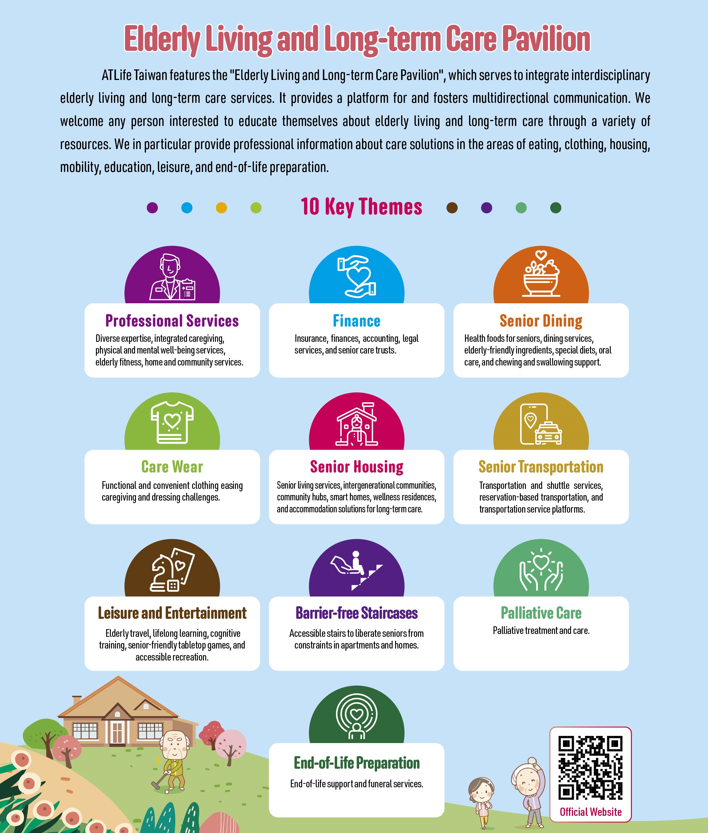 ATLife Taiwan features the "Elderly Living and Long-term Care Pavilion ", which serves to integrate interdisciplinary elderly living and long-term care services. It provides a platform for and fosters multidirectional communication. We welcome any person interested to educate themselves about elderly living and long-term care through a variety of resources. We in particular provide professional information about care solutions in the areas of eating, clothing, housing, mobility, education, leisure, and end-of-life preparation.