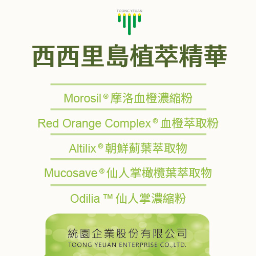 Morosil®摩洛血橙濃縮粉、Red Orange Complex®血橙萃取粉、Altilix®朝鮮薊葉萃取物、Mucosave®仙人掌橄欖葉萃取物、Odilia?仙人掌濃縮粉