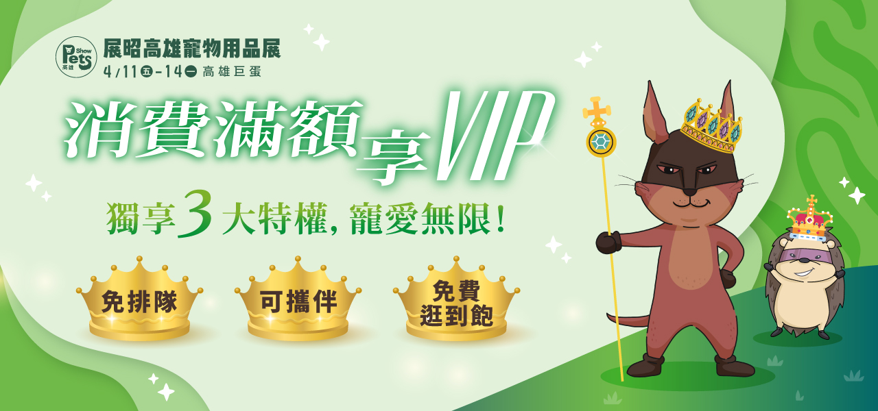 加入展昭寵物展,就是寵你寵到底,成為展昭寵物展VIP,立即享有3大尊榮禮遇: