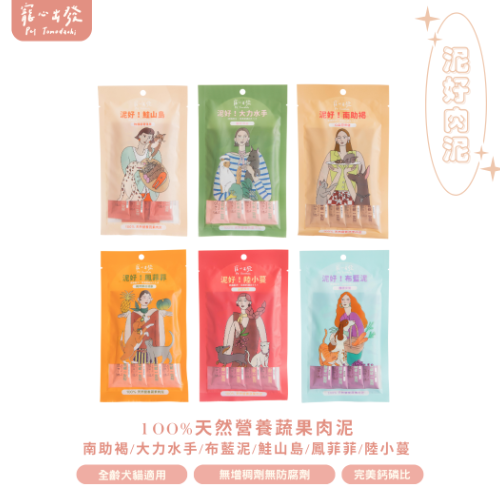 【100%天然營養(yǎng)蔬果肉泥】<br/>* 無增稠劑、無色素、無調(diào)味劑<br/>* 低磷配方,完美鈣磷比 1:1.2<br/><br/>泥好?。?種口味|18g x 4條/包<br/>泥好!大力水手、泥好!南助褐、泥好!布藍(lán)泥<br/>泥好!陸小蔓、泥好!鮭山島、泥好!鳳菲菲<br/>適用全齡犬貓,嚴(yán)選臺(tái)灣在地食材,<br/>用最純粹的成分,做出最天然的肉泥,讓零食可以吃的安心又健康!<br/><br/>貼心提醒:每日餵食,可依據(jù)毛孩的年齡、體型、活動(dòng)調(diào)整餵食。