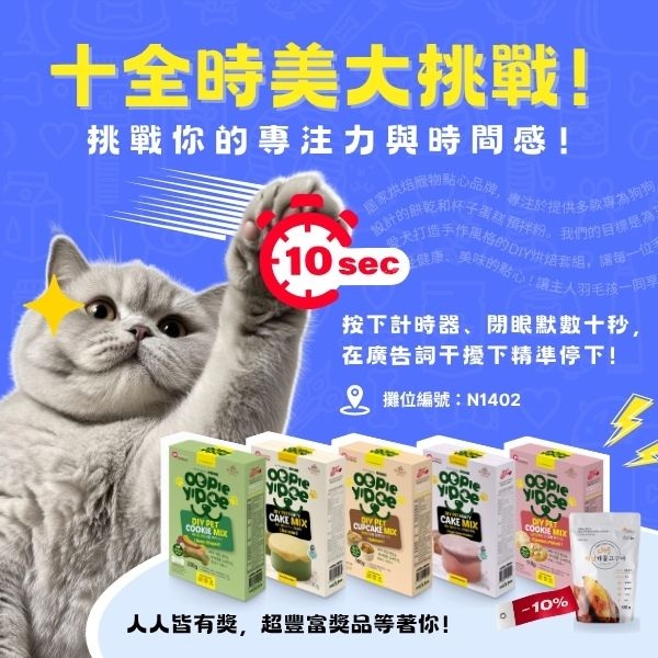 參加《十全時(shí)美?十秒挑戰(zhàn)》,挑戰(zhàn)你的專注力與時(shí)間感!出示追蹤品牌IG頁(yè)面即可參加,按下計(jì)時(shí)器、閉眼默數(shù)十秒,在品牌廣告詞干擾下精準(zhǔn)停下,若達(dá)成10.00秒即送Oopie Yipee DIY 烘焙粉一盒;±0.1秒可得Mypet Doctor地瓜零食;±0.5秒享現(xiàn)場(chǎng)9折折扣券,其他參加者也都能獲得Mypet Doctor試用包組合,人人有獎(jiǎng)、歡樂(lè)無(wú)限!每人有兩次機(jī)會(huì),快來(lái)試試你的十秒感應(yīng)~