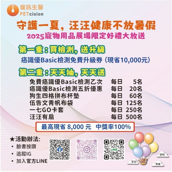 為了讓毛孩爸媽即時(shí)掌握寶貝健康動(dòng)態(tài)、監(jiān)控癌癥警訊,寵訊生醫(yī)舉辦好禮抽獎(jiǎng)活動(dòng),中獎(jiǎng)率100%,送給按讚臉書、追蹤IG和加入官方LINE的朋友們。每日限量抽獎(jiǎng)好禮:免費(fèi)癌識(shí)優(yōu)Basic檢測(cè)乙次(價(jià)值8,000元,5名)、5折癌識(shí)優(yōu)Basic檢測(cè)乙次(現(xiàn)折4,000元,20名)、狗生四格拼布杯墊(60名)、伍告文青帆布袋(125名)、一七GO卡套(250名)、汪汪有扇(500名),還有多種隱藏精美贈(zèng)品。